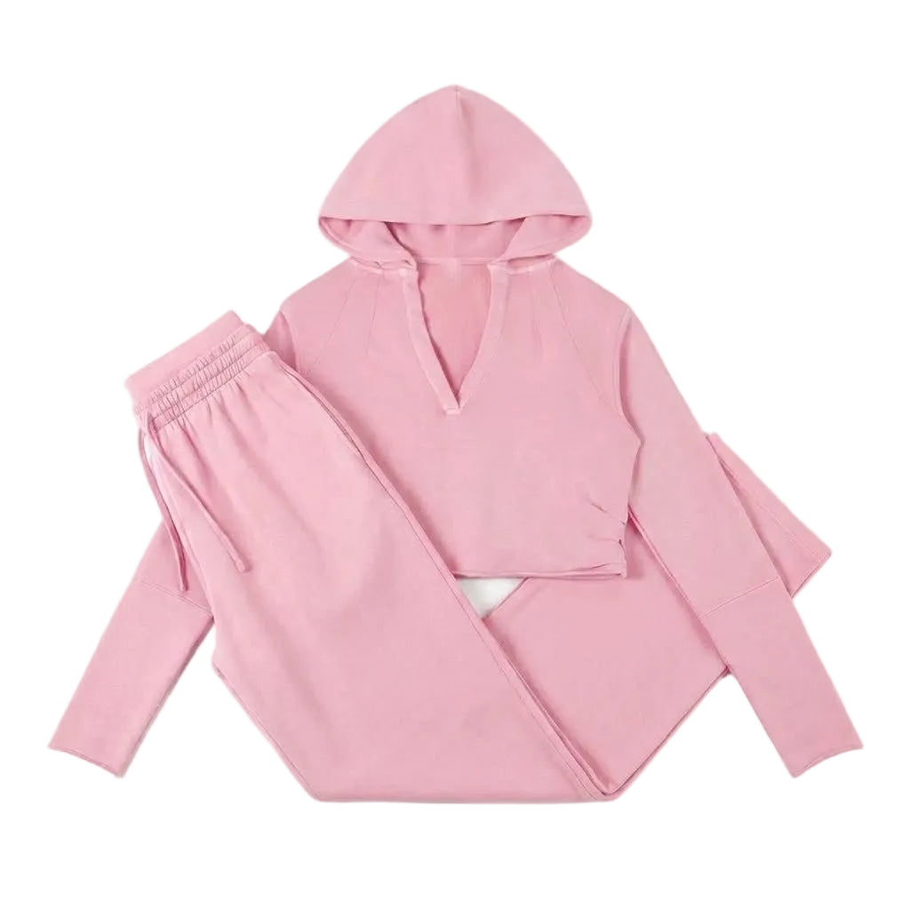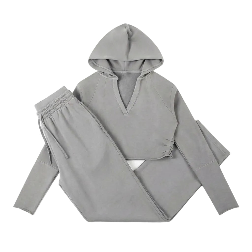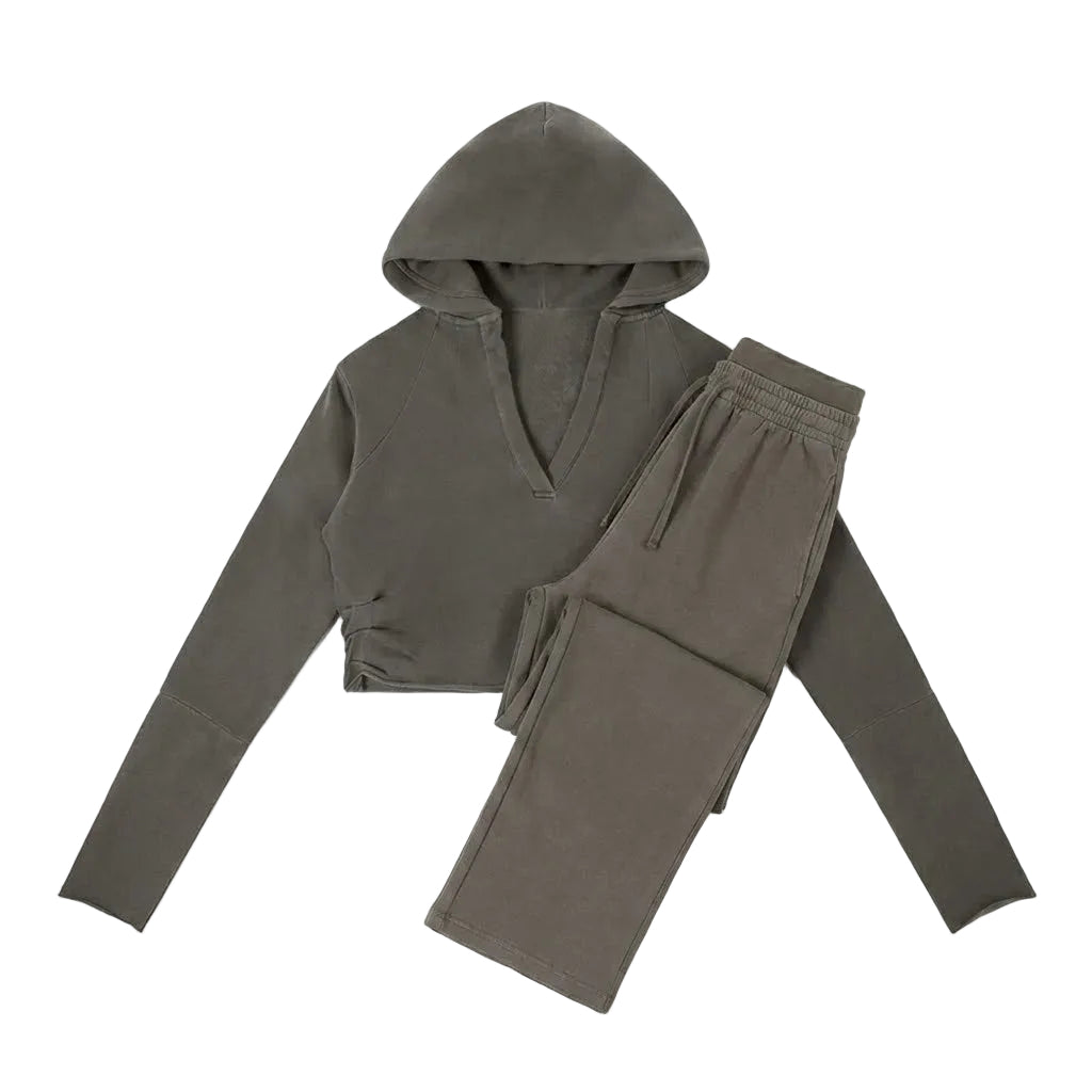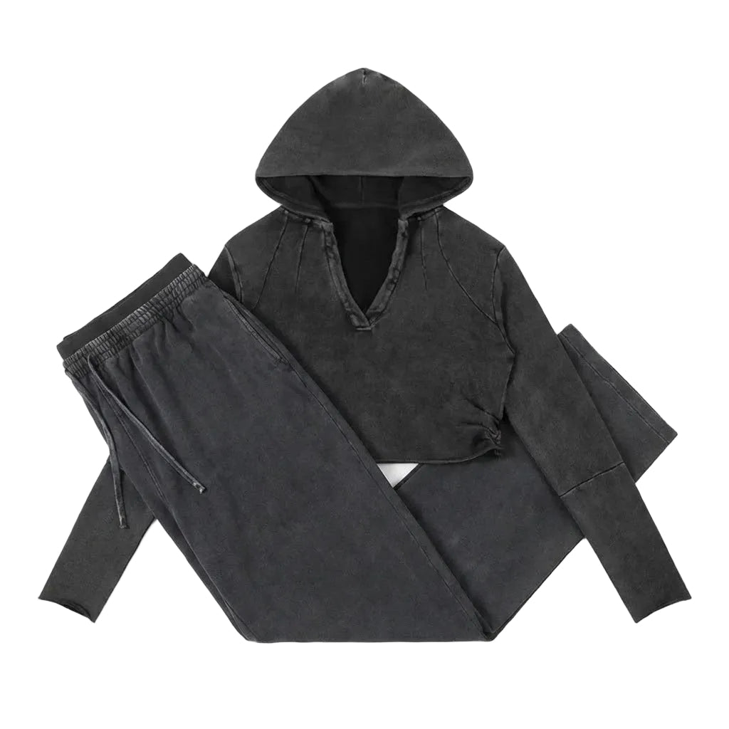 The Vintage Washed Lounge Set combines vintage soul with modern cut, delivering the perfect blend of comfort and structure. This set pairs the Vintage Washed Raw Edge Hoodie, featuring a unique V-neck and unfinished hem, with the flowing Vintage Washed Waist Pants for effortless style.
